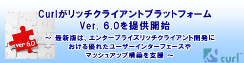 Curl, Incorporated(以下、米国Curl社)は、平成19年11月19日(月)、エンタープライズ向けリッチクライアントの構築を容易にする「Curl Ver 6.0」 をリリースいたしました。最新のCurl Ver 6.0は、拡張されたユーザーインターフェースのスタイリング機能が含まれており、あらゆるCurlアプリケーションにも適合するユーザエクスペリエンス、新鮮で斬新なルック&フィールの構築を可能にします。さらに、Curl Ver 6.0では、JavaScriptとCurlのAPIを統合することができる新しい種類のエンタープライズマッシュアップを実装しています。