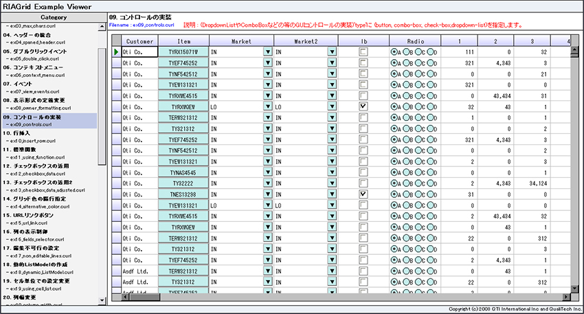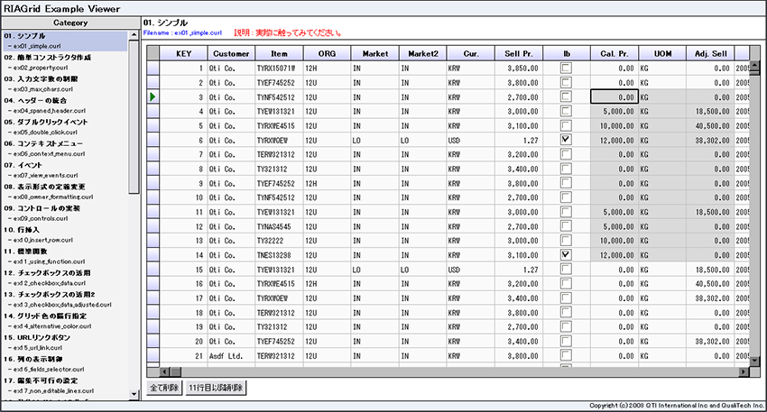 行の挿入、切取りなどのデータ操作、全角ひらがな、半角カタカナ、英数字などの入力制御や右クリックで表示されるコンテキストメニューの設定などの実際の開発に役立つサンプルコードを提供します。