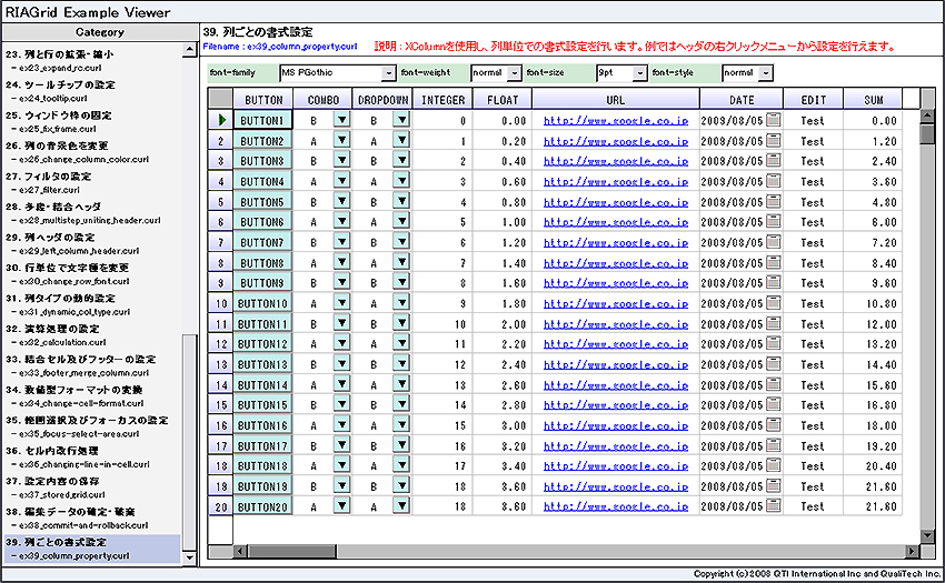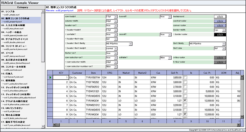 列幅や行幅、グリッドの背景色、セル編集/非編集モード、スクロールバーの有無、フォントサイズの大きさなど引数を渡してやるだけで容易に設定できます。