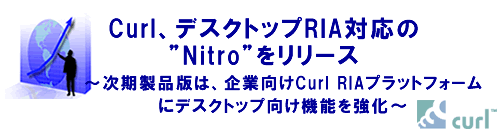 2008年4月21日、Curl, Incorporated(以下、米Curl社)は、Web2.0Expo(サンフランシスコ、米国)において、昨今の企業が求める拡張されたデスクトップ機能を持つCurl RIAプラットフォーム、コードネームCurl “Nitro”のβ版のリリースを発表しました。