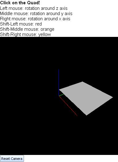 {import * from CURL.GRAPHICS.SCENE} {import * from CURL.PGUIDE.SCENEUTILS, location = "../../default/support/SceneUtils.scurl"} {value let scene:ExampleScene = {ExampleScene} {scene.camera-setup} let scene-graphic:SceneGraphic = {SceneGraphic scene, width=4in, height=4in, background = {FillPattern.get-black} } let quad:Quad = {Quad 0in, 0in, z = 1ft, 4ft, 4ft, {on e:PointerPressSceneEvent at obj:Quad do {if e.state-mask.shift? then {if e.button == left-button then set obj.fill-pattern = {FillPattern.get-red} } {if e.button == middle-button then set obj.fill-pattern = {FillPattern.get-orange} } {if e.button == right-button then set obj.fill-pattern = {FillPattern.get-yellow} } else {if e.button == left-button then {obj.rotate {Fraction3d 0, 0, 1}, 10deg} } {if e.button == middle-button then {obj.rotate {Fraction3d 0, 1, 0}, 10deg} } {if e.button == right-button then {obj.rotate {Fraction3d 1, 0, 0}, 10deg} } } } } {scene.add-object quad} {scene.add-object {make-axis-object 1m}} let reset-camera:CommandButton = {CommandButton label = "Reset Camera", {on Action at b:CommandButton do {scene.camera-setup} {scene-graphic.update-drawable} } } {VBox {text font-weight="bold", Click on the Quad!}, {text Left mouse: rotation around z axis}, {text Middle mouse: rotation around y axis}, {text Right mouse: rotation around x axis}, {text Shift-Left mouse: red}, {text Shift-Middle mouse: orange}, {text Shift-Right mouse: yellow}, scene-graphic, reset-camera } } |